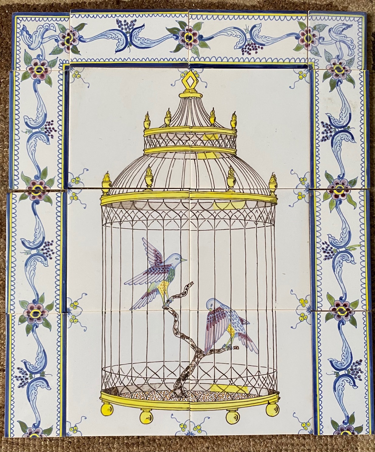 A beautiful vintage hand-painted Delft tile panel featuring an ornate decorative bird cage with two birds perched inside. Formed from 6 main tiles, this elegant design can be purchased on its own or with the optional decorative border for a more complete framed finish. Part of the rare remaining Jones Tiles collection, with limited stock available.